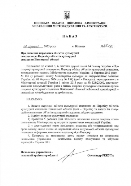 У Вінницькій області ще 27 об’єктів офіційно отримали статус щойно виявлених пам’яток культурної спадщини місцевого значення. Відповідний наказ затвердили в Управлінні містобудування та архітектури Вінницької обласної військової адміністрації.