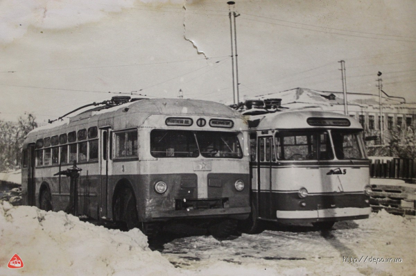 Тролейбуси МТБ-82 (№3) та Київ5 (ЛАЗ) на території трамвайного депо на ремонті.