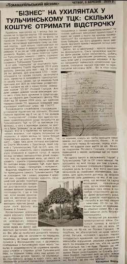Скарги на діяльність окремих працівників та керівників Тульчинського терцентру комплектування вже не раз ставали публічними. Але особлива специфіка співіснування місцевих органів влади залізною завісою прикриває можливі зловживання. Про них вчерговий раз розповіла газета “Томашпільський вісник” від 6.03. 2025 року. Сподіваємось, що на цей раз повноважні правоохоронні органи звернуть на це увагу.