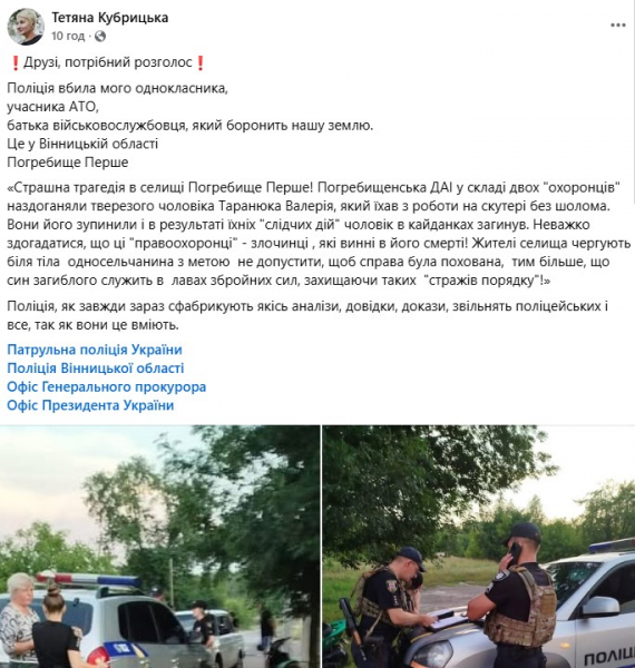 «Страшна трагедія в селищі Погребище Перше! Погребищенська ДАІ у складі двох "охоронців" наздоганяли тверезого чоловіка Таранюка Валерія, який їхав з роботи на скутері без шолома. Вони його зупинили і в результаті їхніх "слідчих дій" чоловік в кайданках загинув. Неважко здогадатися, що ці "правоохоронці" – злочинці , які винні в його смерті! Жителі селища чергують біля тіла односельчанина з метою не допустити, щоб справа була похована, тим більше, що син загиблого служить в лавах збройних сил, захищаючи таких "стражів порядку"!»