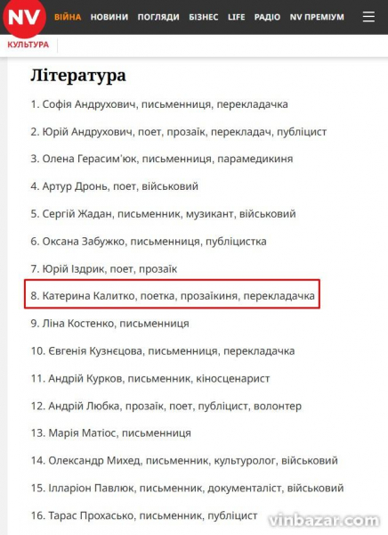 19 вересня редакція журналу NV оголосила перелік "100 людей культури". До нього увійшли митці, які продовжують створювати шедеври попри найважчі воєнні часи. Серед лауреатів – поетеса Катерина Калитко з Вінниці.