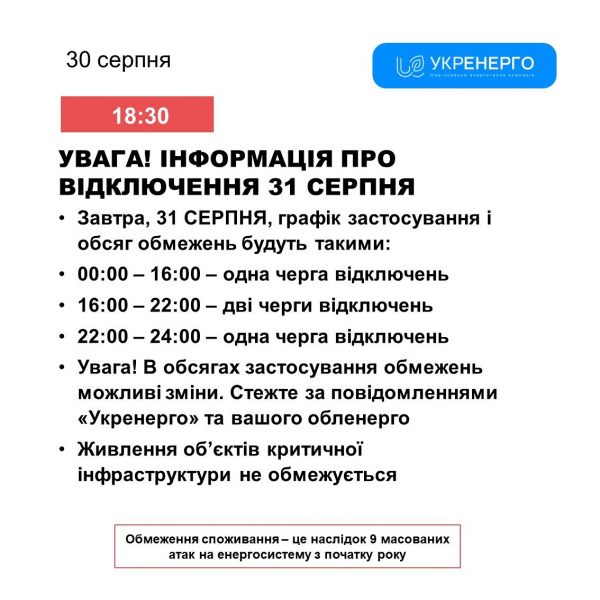 Сьогодні, 31 серпня, в Україні та Вінниччині будуть запроваджувати графіки обмежень електропостачання. На Вінниччині графіки погодинних відключень застосовуватимуть впродовж доби.