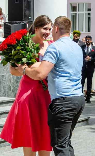Щойно шестикурсниця стоматологічного факультету Тамара Денисюк отримала диплом, коханий, який служить в Національній поліції, освідчився їй — просто на червоній доріжці перед головним корпусом університету.