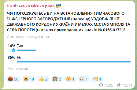 "Хоча тема безпеки, кордону й державного суверенітету в час війни є надважливою, реакція частини мешканців виявилась настороженою. І це зрозуміло: будь-яке технічне втручання у звичний ландшафт викликає питання, особливо якщо комунікація з громадою була формальною й не дала відповідей, які люди хотіли почути. Опитування, яке проводить Ямпільська міська рада, — це правильний крок у напрямку відкритості та взаємодії з громадою. Воно дозволяє зняти напругу, врахувати думки мешканців і підсилити довіру до рішень. Водночас, сама форма запитання була сформульована занадто технічно і без пояснення суті, причин і наслідків, що викликає нині непорозуміння й хвилювання. Комунікація про безпеку має бути не лише законною, а й людяною", – йдеться у повідомленні.