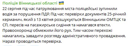 "22 серпня під час патрулювання міста поліцейські зупинили водія за порушення ПДР. Під час перевірки документів 25-річний керманич, який з 13 квітня розшукується Вінницьким ОМТЦК та СП, пересів на пасажирське сидіння та намагався втекти. Правоохоронці обмежили його рух. Тим часом перехожі намагались завадити розгляду адміністративного провадження. Наразі проводиться перевірка".
