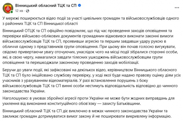 "Вінницький ОТЦК та СП офіційно повідомляє, що під час проведення заходів оповіщення та перевірки військово-облікових документів громадянин відмовився виконати законні вимоги військовослужбовців ТЦК та СП, проявивши агресію та першим завдавши удару рукою в обличчя одному з представників групи оповіщення. При цьому він почав голосно вигукувати, свідомо привертаючи увагу оточуючих, унаслідок чого на місці події зібралися сторонні особи, які, в свою чергу, намагалися завдати тілесних ушкоджень військовослужбовцям групи оповіщення та перешкоджали законному проведенню заходів мобілізації.