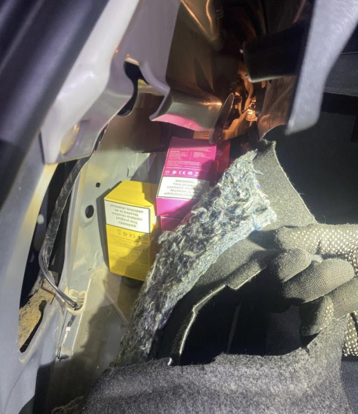 • в багажному відсіку з лівої сторони, за обшивкою ‒ електронні пристрої для куріння, в кількості 20 штук, з написом «Elfbar»;