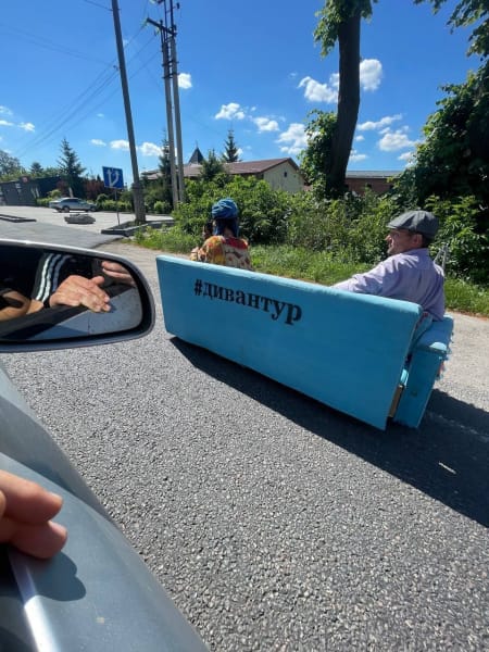 Аркадій та Олена вирушили в тур по містах України на електричному самокатному дивані власної розробки з Тернопільської області до Києва, щоб зібрати кошти на виробництво розмінувальних машин. Аркадій пересилився на Тернопільщину в Заліщики зі Слов’янська.