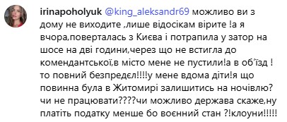 "А я вчора, поверталась з Києва і потрапила у затор на шосе на дві години, через що не встигла до комендантської, в місто мене не пустили, а в обʼїзд, то повний безпредєл! У мене вдома діти! Я що повинна була в Житомирі залишитись на ночівлю? Чи не працювати?"