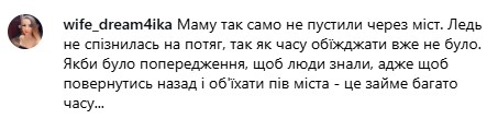 "Маму так само не пустили через міст. Ледь не спізнилась на потяг, так як часу обїжджати вже не було. Якби було попередження, щоб люди знали, адже щоб повернутись назад і об'їхати пів міста – це займе багато часу…"