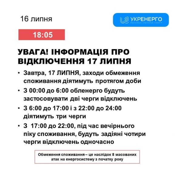 * Від 17:00 до 22:00, під час вечірнього піку споживання, будуть задіяні чотири черги відключень одночасно.
