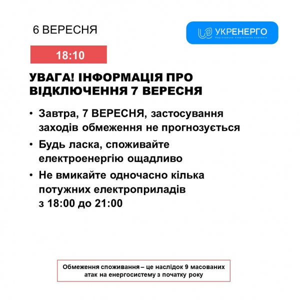 «У суботу, 7 вересня, обмеження електропостачання в Україні не заплановані», – йдеться у повідомленні.