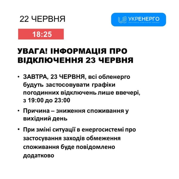 Такий термін дії відключень, за інформацією НЕК «Укренерго» пов’язаний із зниженням споживання електроенергії у вихідний день, відключення світла застосовуватимуть тільки ввечері, з 19:00 до 23:00.