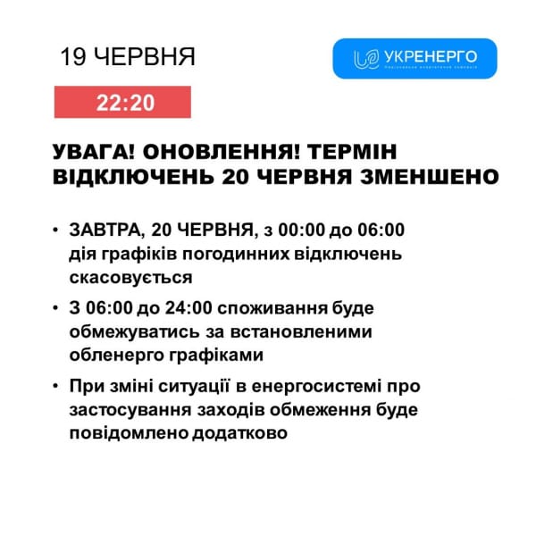 Сьогодні, 20 червня, очікується підвищення температури та відповідно й попиту на електроенергію. Тому обсяги споживання з 6 години ранку до 24 години будуть обмежуватися місцевими обленерго.