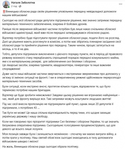 Моя позиція завжди була і залишається незмінною – спочатку ми маємо виграти війну, а потім грати у політику. Наш святий обовʼязок сьогодні знаходячись в тилу допомагати військовим швидко і якісно! На жаль, Вінницька обласна рада сьогодні обрала політику", – зазначила Заболотна.