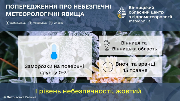 "Вночі та вранці, 13 травня, на поверхні грунту очікуються заморозки 0..-3°. І рівень небезпечності. Заморозки можуть нанести шкоду сходам ярих культур і садам в період цвітіння", – йдеться у повідомленні.