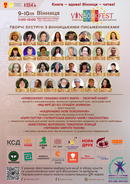 9-10 травня у Вінниці відбудеться щорічний літературний фестиваль VinBookFest 2025. На відвідувачів очікують зустрічі з авторами, книжкові виставки, тематичні заходи для дітей і дорослих, творчі майстерки та благодійні ініціативи.