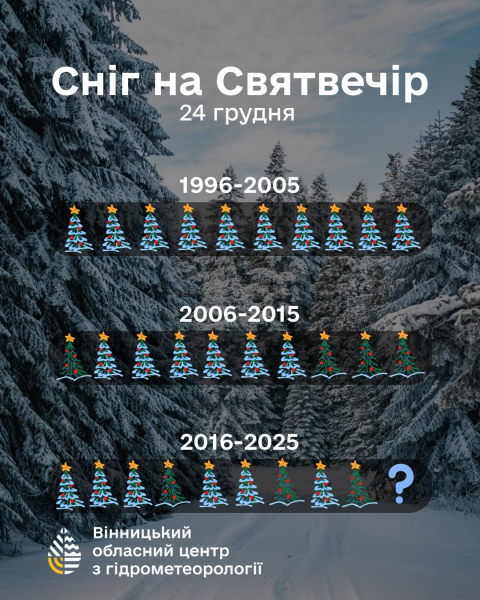 За підрахунками Вінницького обласного центру з гідрометеорології, за останні 30 років у Вінниці снігу на Святвечір не було всього 7 разів. Святкувати за плюсової температури доводилося у 2006, 2013, 2013, 2015, 2019, 2022 та 2024 роках.