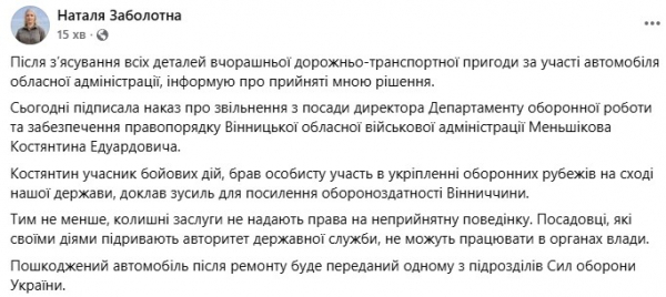 "Після зʼясування всіх деталей вчорашньої дорожньо-транспортної пригоди за участі автомобіля обласної адміністрації, інформую про прийняті мною рішення. Сьогодні підписала наказ про звільнення з посади директора Департаменту оборонної роботи та забезпечення правопорядку Вінницької обласної військової адміністрації Меньшікова Костянтина Едуардовича. Костянтин учасник бойових дій, брав особисту участь в укріпленні оборонних рубежів на сході нашої держави, доклав зусиль для посилення обороноздатності Вінниччини. Тим не менше, колишні заслуги не надають права на неприйнятну поведінку. Посадовці, які своїми діями підривають авторитет державної служби, не можуть працювати в органах влади. Пошкоджений автомобіль після ремонту буде переданий одному з підрозділів Сил оборони України", – йдеться у повідомленні.