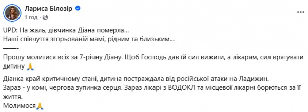 "Семирічна Діана, яка постраждала під час атаки на Ладижин, померла. Попри зусилля медиків Вінницької обласної дитячої лікарні та місцевих лікарів, врятувати дитину не вдалося. Щирі співчуття рідним і близьким", – йдеться у повідомленні.