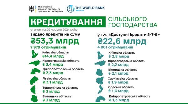 З початку року 7 979 агрогосподарств отримали понад 53,3 млрд гривень банківських кредитів на розвиток. З них за державною програмою «Доступні кредити 5-7-9» – 4 801 господарство профінансовано на 22,6 млрд гривень. На Вінниччині загалом прокредитовано 763 суб’єкти на суму 3 млрд гривень.