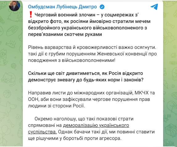 «Рівень варварства й кровожерливості неможливо осягнути. Такі дії є грубим порушенням Женевської конвенції про поводження з військовополоненими», – наголосив Уповноважений.