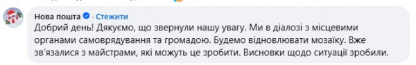Згодом офіційний аккаунт "Нової пошти" залишив інший коментар під дописом, де переконують, що відновлять мозаїку.