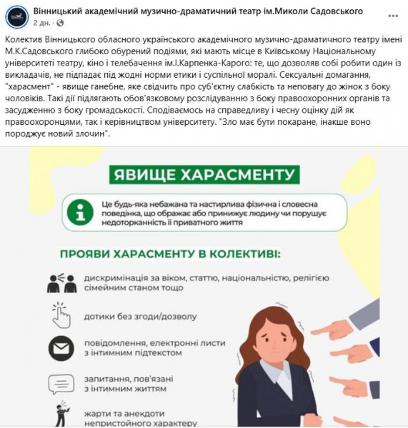 "Колектив Вінницького обласного українського академічного музично-драматичного театру імені М.К.Садовського глибоко обурений подіями, які мають місце в Київському Національному університеті театру, кіно і телебачення ім.І.Карпенка-Карого: те, що дозволяв собі робити один із викладачів, не підпадає під жодні норми етики і суспільної моралі. Сексуальні домагання, "харасмент" – явище ганебне, яке свідчить про суб'єктну слабкість та неповагу до жінок з боку чоловіків. Такі дії підлягають обов'язковому розслідуванню з боку правоохоронних органів та засудженню з боку громадськості. Сподіваємось на справедливу і чесну оцінку дій як правоохоронцями, так і керівництвом університету. "Зло має бути покаране, інакше воно породжує новий злочин", – йдеться у заяві.