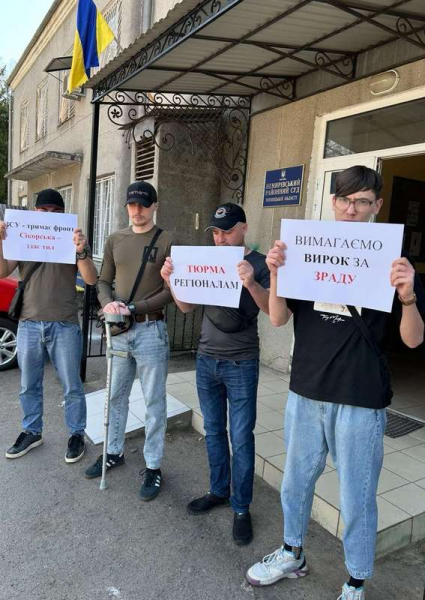 Біля суду поранені воїни, мобілізовані інваліди влаштували пікет. Вони вимагали не затягувати справу цієї підозрюваної у зраді та інших зрадників.