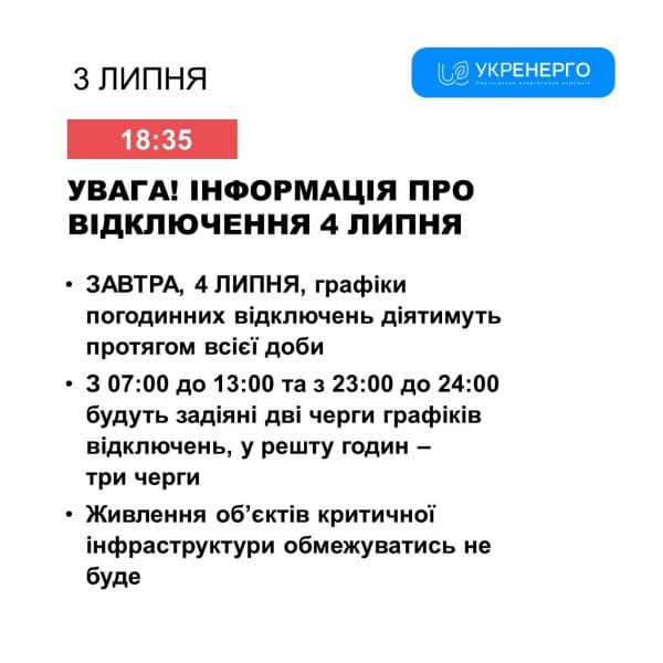 «4 липня за вказівкою НЕК «Укренерго» графіки відключень будуть застосовуватись впродовж всієї доби», – йдеться у повідомленні.
