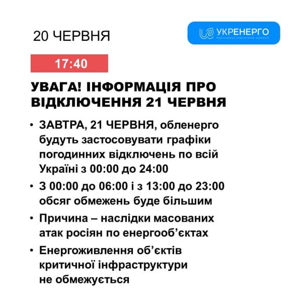 Сьогодні, 21 червня, очікується підвищена температура та дефіцит електроенергії. Але головна причина обмежень на сьогодні – удари росіян по енергооб’єктах. Тому обсяги споживання до 24 години будуть обмежуватися місцевими обленерго.