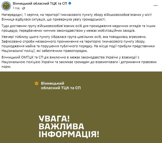 "Напередодні, 1 серпня, на території тимчасового пункту збору військовозобов’язаних у місті Вінниця відбулася ситуація, що привернула увагу громадськості.