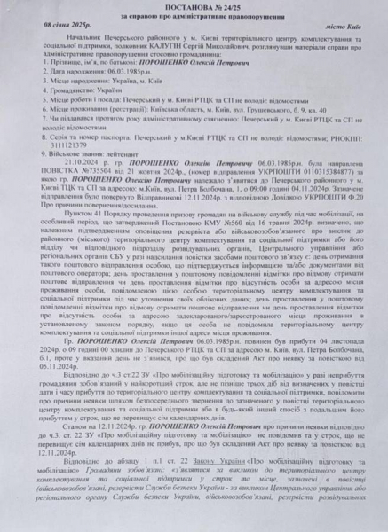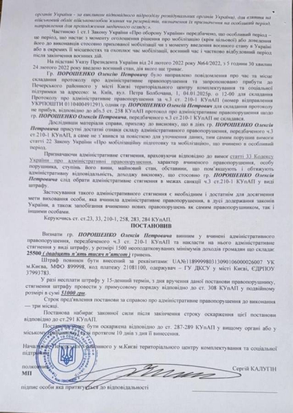 “Визнати гр. Порошенка Олексія Петровича винним у вчинені адміністративного правопорушення, передбаченого 4.3 ст. 210-1 КУпАП та накласти на нього адміністративне стягнення у виді штрафу, у розмірі 1500 неоподатковуваних мінімумів доходів громадян, що складає 25 500 грн”, – йдеться у постанові начальника Печерського ТЦК та СП у м. Києві.