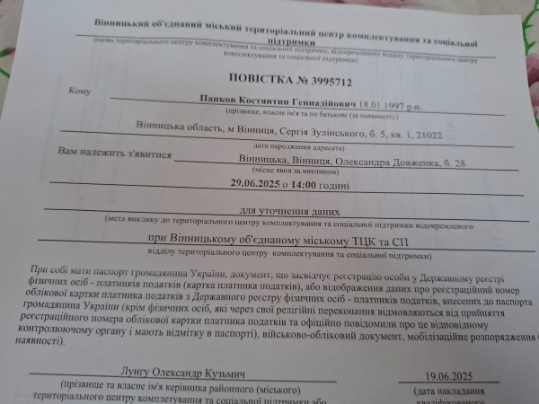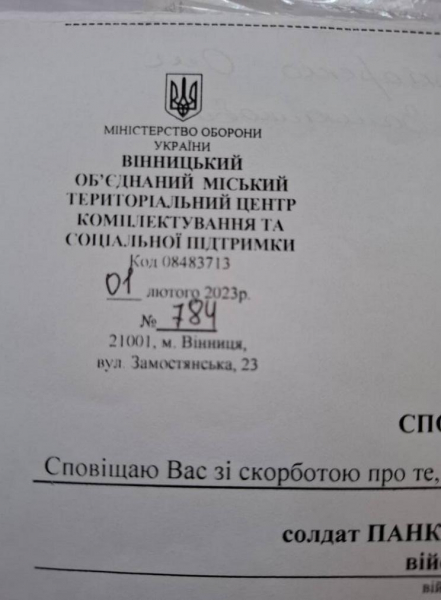У Вінниці родині полеглого на війні 26-рінчого Костянтина Панкова прийшла повістка з вимогою оновити дані в територіальному центрі комплектування і соціальної підтримки. У обласному ТЦК перепросили, а причиною інциденту назвали "технічну помилку".