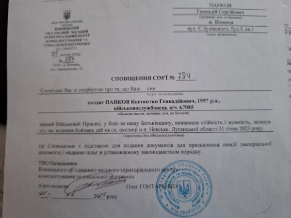"Вінницький обласний територіальний центр комплектування та соціальної підтримки висловлює щирі співчуття рідним і близьким загиблого Героя, солдата Панкова Костянтина Геннадійовича, який був вірний присязі, став на захист держави і віддав своє життя, захищаючи Україну.