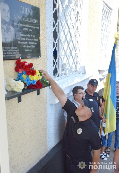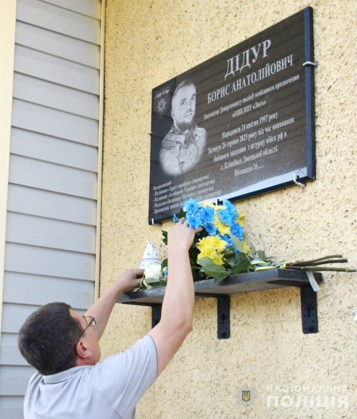 26-річний Борис Дідур загинув 26 серпня 2023 року під час виконання бойового завдання поблизу Бахмут. Її встановили на адмінприміщенні територіального підрозділу поліцію, в якому полеглий захисник працював інспектором з ювенальної превенції.
