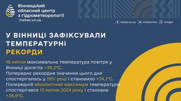 Днем раніше, 16 липня, у Вінниці був перевищений абсолютний максимум температури повітря за весь період спостережень. Сильна спека досягла значення +39,2°C.