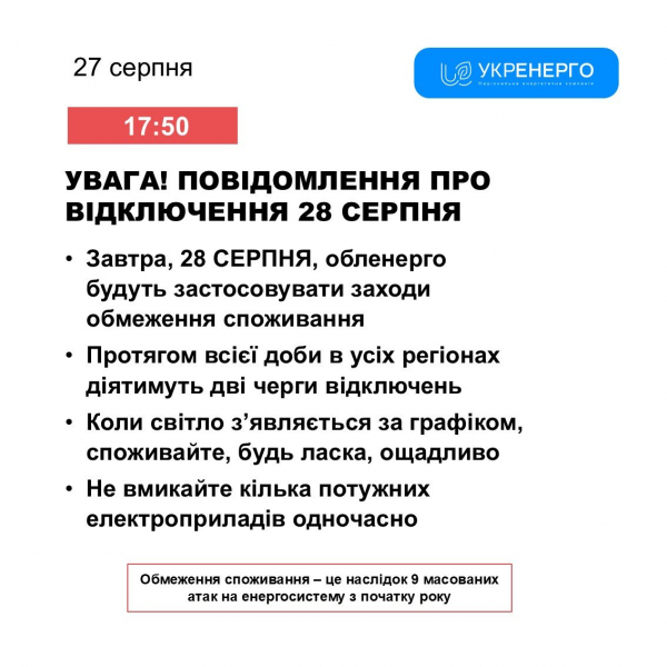 «Від НЕК «Укренерго» отримали завдання про застосування Графіків погодинних відключень електроенергії для Вінницької області. Відключення за ГПВ діятимуть з 00:00 – 24:00 годин».