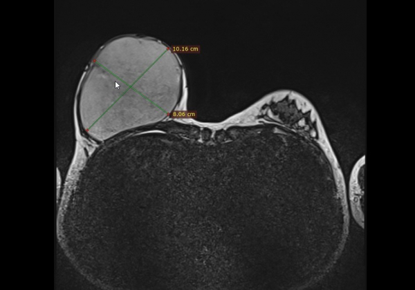 За результатами ультразвукового дослідження (УЗД) було виявлено велике об’ємне утворення розмірами 9х8 см, яке відтискало тканини залози вгору та назовні. Для уточнення діагнозу була проведена трепан-біопсія. Гістологічне дослідження підтвердило наявність рідкісної пухлини — «Гігантської ювенільної фіброаденоми», яка становить лише 0,5-2% від усіх новоутворень грудної залози та переважно зустрічається у молодих пацієнток.