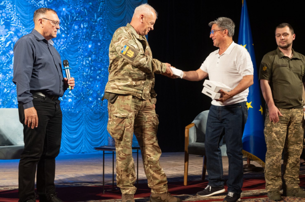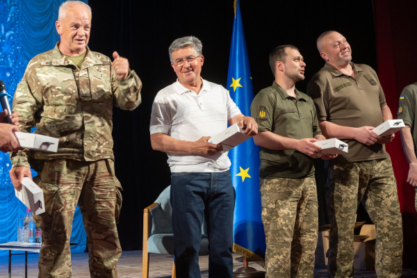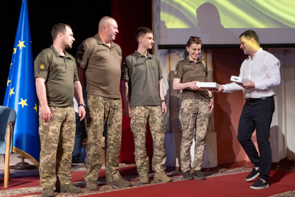 Присутні представники ЗМІ та військові отримали безперебійні блоки живлення для своїх ноутбуків та гаджетів, накопичувальні пристрої та сертифікати на придбання книжок у вінницькій книгарні «Герої».