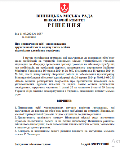 Затвердили рішення «Про призначення осіб, уповноважених вручати повістки та видачу таким особам відповідних службових посвідчень» на останньому засіданні міськвиконкому у Вінниці.
