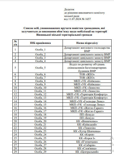 Рішенням виконкому міськради затверджено список з 39 осіб із числа працівників окремих департаментів, ЖЕО, та обслуговуючих комунальних компаній, яких уповноважили вручати повістки за місцем проживання.