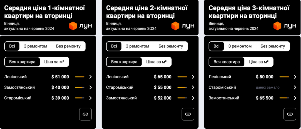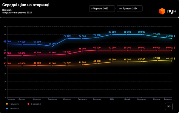 За даними ЛУН, вартість оренди однокімнатних квартир у Вінниці у червні становила 11 000 грн, що на 500 грн менше (-4.3%) порівняно з попереднім місяцем. Двокімнатні квартири залишилися на рівні 12 000 грн, без змін (0.0%). Трикімнатні квартири знизилися в ціні на 1 249.5 грн (-8.3%) і тепер коштують 13 750 грн.