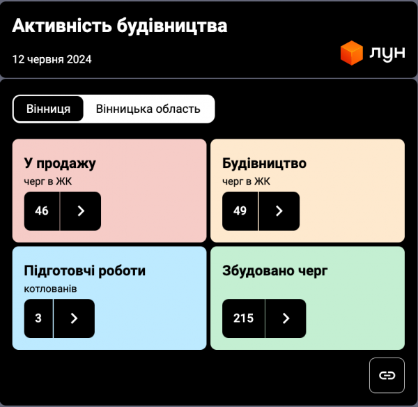 Наразі у Вінниці продається 46 черг будинків, будується 49 черг, на стадії підготовчих робіт знаходиться 3 черги. У Вінницькій області продається 65 черг новобудов, на стадії будівництва знаходиться 71 черга, на стадії підготовчих робіт – 6 черг.