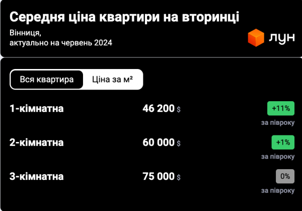 За дослідженням експертів ЛУН, вартість однокімнатних квартир у Вінниці у червні становила 46 150$ (на 11.79% більше ніж пів року тому), що на 850$ менше порівняно з попереднім місяцем.