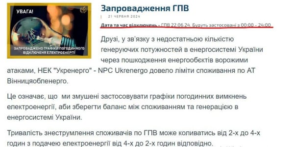 Щодо другої інформації, то на сайті АТ «Вінницяобленерго» вже декілька днів розміщують оголошення з однаковим текстом, тільки зі зміненими датами: