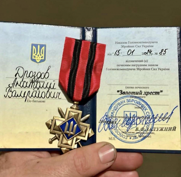 Танкіст Анатолій Дроздов з Бершаді підписав контракт з Збройними силами України у 2020 році й відтоді безперервно боронить Україну. Чоловіка двічі відзначили нагрудним знаком "Золотий хрест", а також нагородою від командира 59 окремої штурмової бригади. Військовий допоміг забезпечити прорив на Антонівському мосту в перші дні вторгнення РФ.