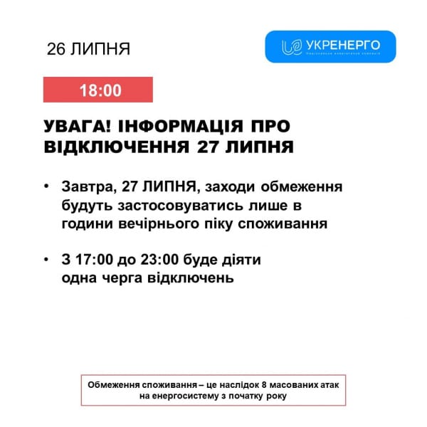 «27 липня, заходи обмеження будуть застосовуватись лише в години вечірнього піка споживання», – йдеться у повідомленні.