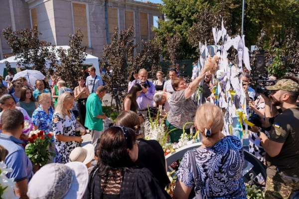 Сьогодні, 14 липня, на площі Перемоги до пам’ятного знаку «Жертвам ракетних ударів по Вінниці» представники влади, громадськості, родичі та близькі загиблих, а також усі небайдужі вінничани поклали живі квіти та іграшки, вшановуючи пам’ять загиблих від ракетного удару «Калібрами» два роки тому.