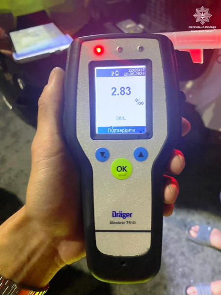 «Спілкуючись із водієм, інспектори помітили в нього ознаки алкогольного сп’яніння. Чоловік пройшов огляд на алкотестері Драгер. У його організмі виявили 2,83 проміле алкоголю.